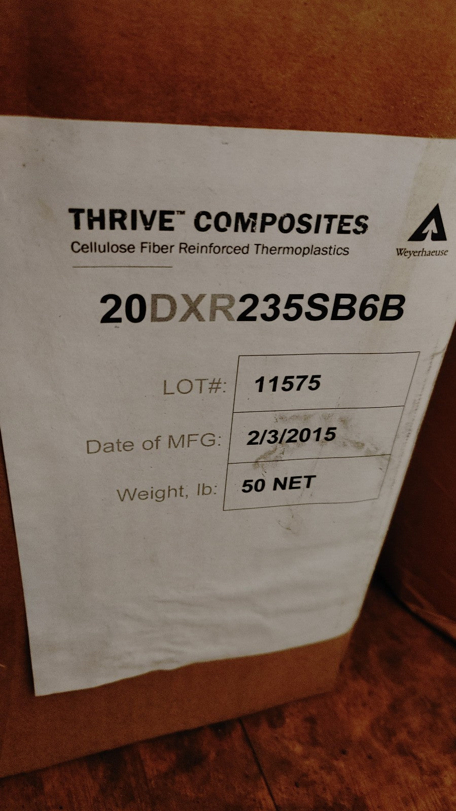 THRIVE™ 20DXR235SB6B by Weyerhaeuser Company is a cost effective, recycled polypropylene (PP) resin (75.5%) reinforced with cellulose fiber (20%). Offers good fiber dispersibility and benefits such as lower part mass, improved manufacturing efficiency, less energy to produce finished parts and full design flexibility. Also offers improved molding cycle time (up to 35% faster), reduced mass (cellulose fiber is 40% less dense), less abrasion, reduced wear & tear, comparable mechanical properties, lower finished composite density & better surface bonding when compared to composites reinforced with short glass fibers. Shows superior mold flow in large components, strong knit-line strength in mitigated components, fast filling of molds to optimize production, better performance at higher temperatures, higher modulus, improved chemical resistance & lower wall thickness when compared to styrenic and olefinic compounds. Contains compatibilizer and available as black colored pellets. It is suitable for processing by injection molding. THRIVE™ 20DXR235SB6B is applicable for automotive interior part, industrial bracket, office furniture leg endcap, industrial pump housing assembly, food industry spatula, household goods & kitchenware, small & large appliances, industrial goods, consumer personal goods, building & construction goods applications.